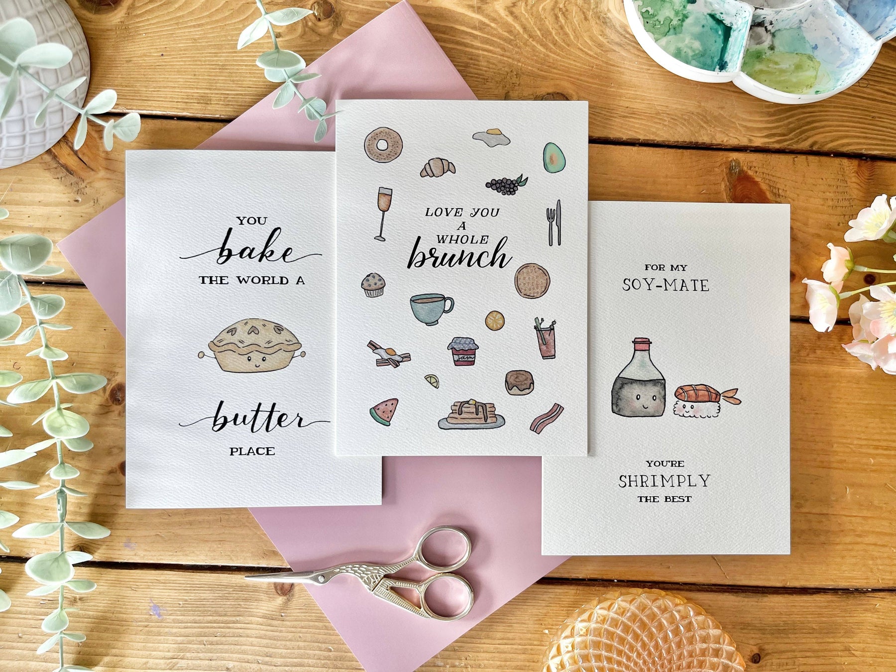 A playful and charming greeting card featuring hand-painted soy sauce bottle and shrimp sushi illustrations in our signature whimsical watercolor style. With the punny message “For My Soy Mate, You’re Shrimply The Best,” this card is perfect for celebrating friendship, appreciation, or just sharing a smile with sushi lovers.
